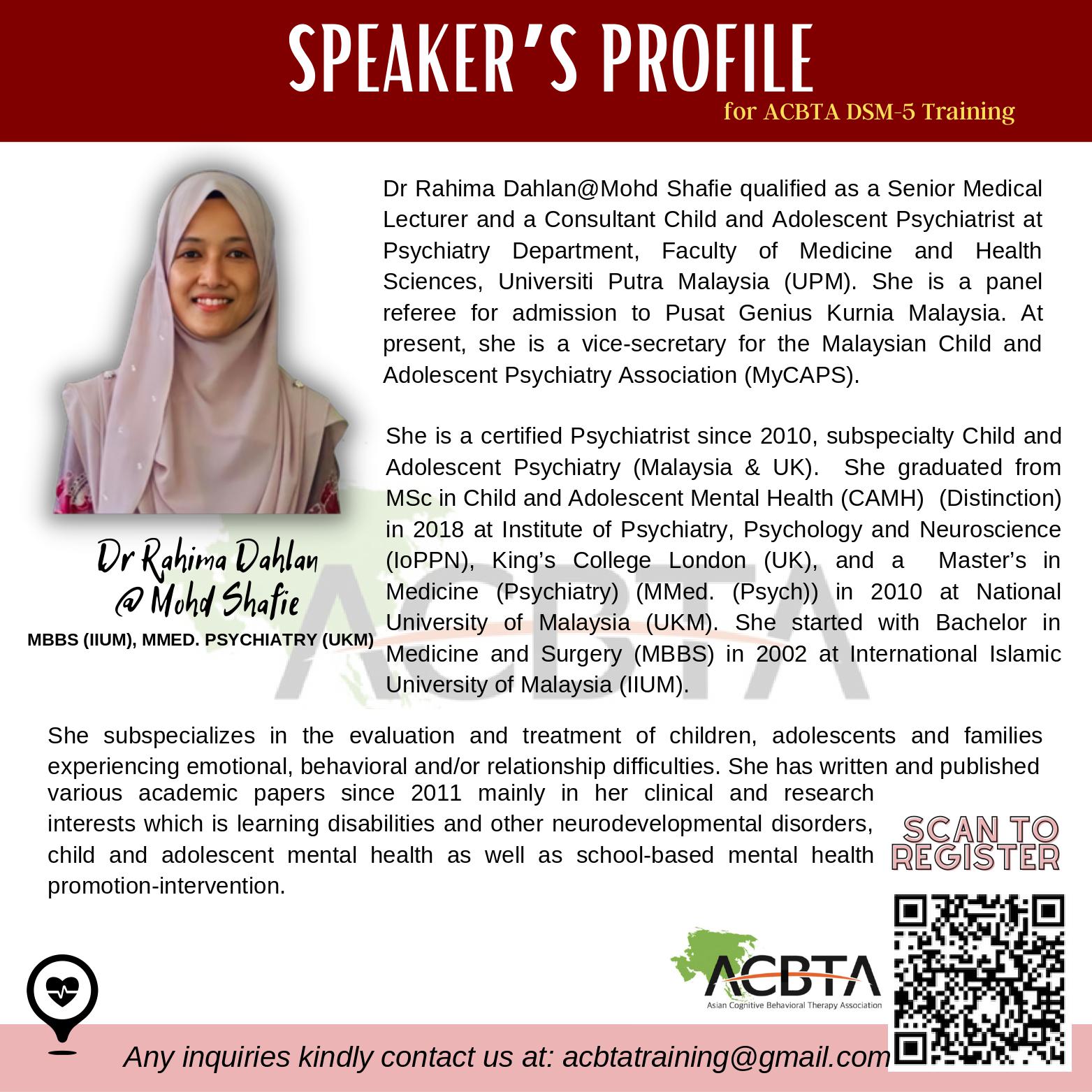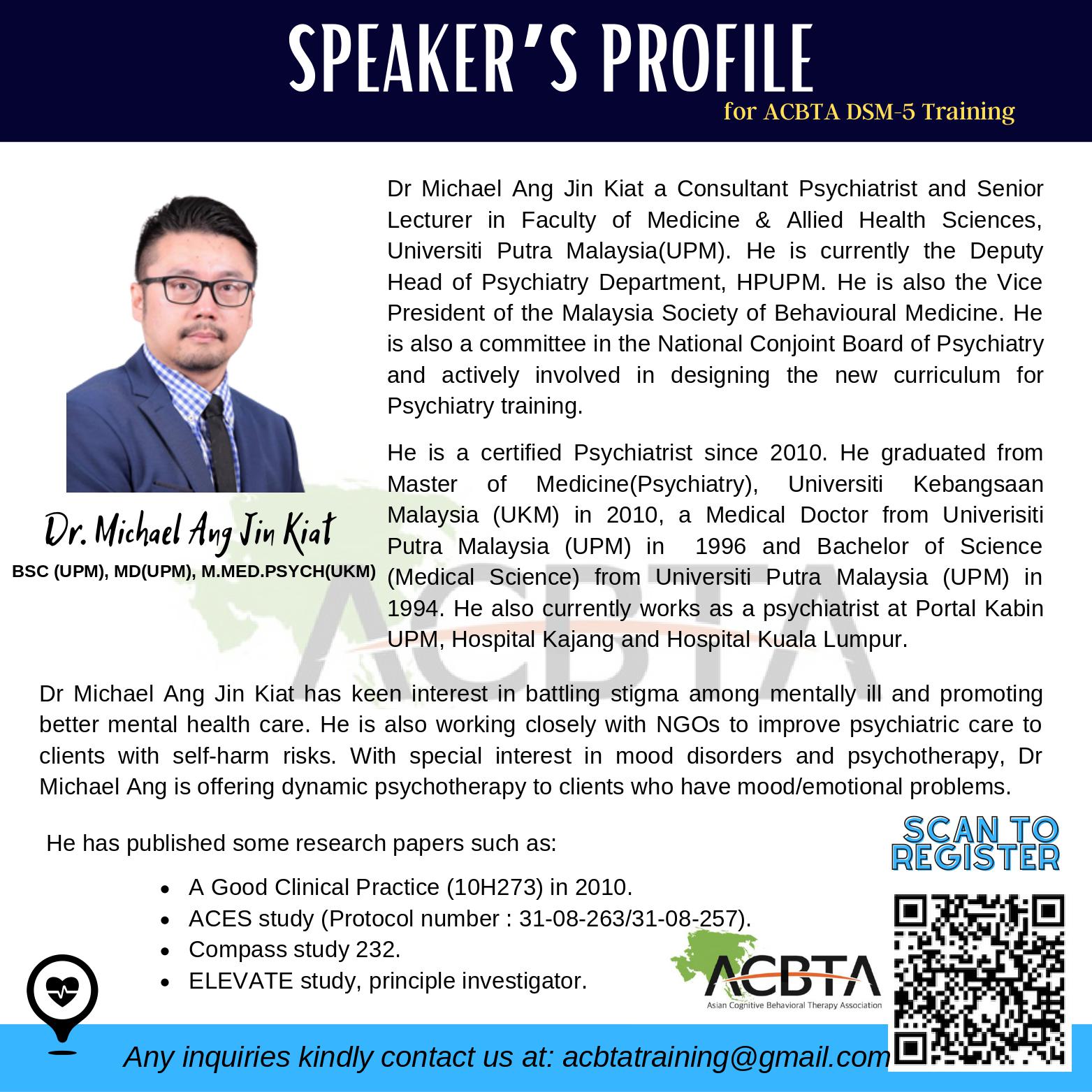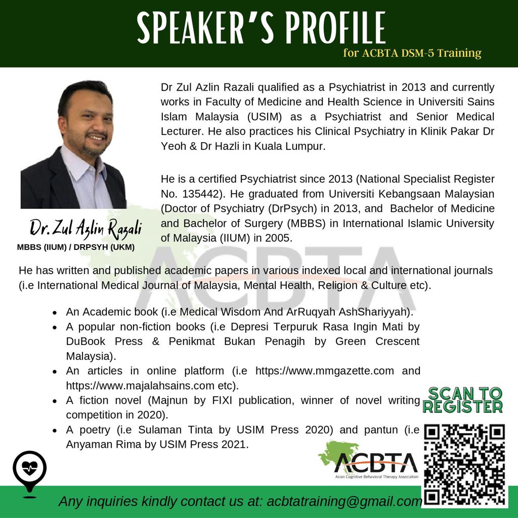 We are targeting mental health professionals working within the clinical setting who are interested to gain familiarity with the DSM-5 as a diagnostic tool, and how clinical formulations for intervention are put together. These understanding would contribute to personal competencies in providing support to patients with mental health conditions that need treatment.